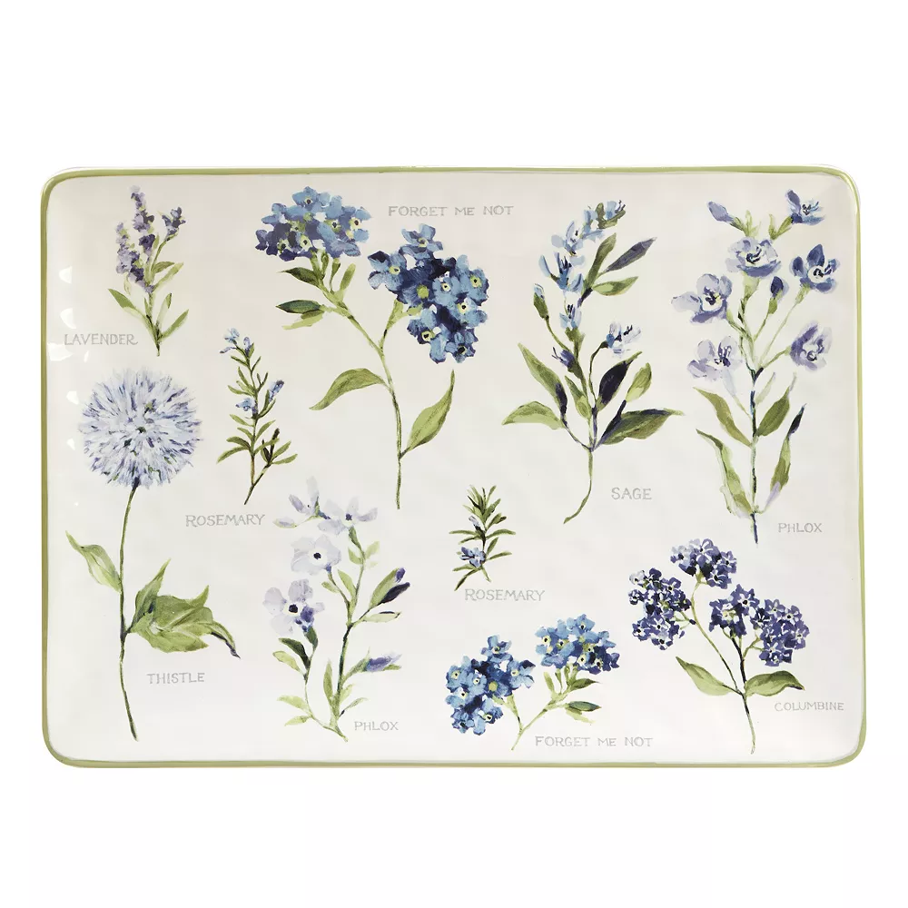 Lovely watercolor-inspired herbs decorate this Certified International Fresh Herbs rectangle platter, the perfect choice for any gardener’s kitchen.